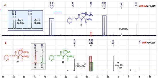 It should be noted that in the case of the bisphosphonic derivative of serine 5l, the final one-pot reaction was successfully carried out only when the Hünig’s base was also used as a catalyst and when the reaction temperature was raised to 70 °C. The selection of such parameters undoubtedly facilitated the transformation of the indirectly formed phosphonium salt 4l into the target product 5l (Figure 3b), which was obtained with a yield of 52% (Scheme 4, entry 18). The course of the reaction at a lower temperature or without the use of a catalyst ended at the stage of phosphonium salt generation, which can be seen in the 31P NMR spectrum of the reaction mixture in the form of two doublets with the same coupling constant, which was accompanied by the very small signal of the desired product 5l (δ = 17.9 ppm) (Figure 3a).