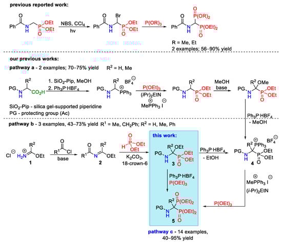 Synthetic routes for the synthesis of tetraethyl 1-(N-acylamino)alkylene-1,1-bisphosphonates from α-functionalized derivatives of phosphorus analogs of α-amino acids, such as diethyl 1-(N-benzoylamino)bromomethylphosphonate [29] and diethyl 1-(N-acetylamino)-1-triphenylphosphoniumalkylphosphonate tetrafluoroborates 4 obtained from α-methoxyphosphonates (pathway a) [30] or α-ethoxyphosphonates (pathway b) [33].