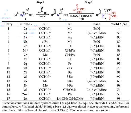 These modifications in the acylation step of ethyl imidate hydrochlorides 1, most often with benzyl chloroformate, require a different base for this reaction (hitherto, Et3N has been used in the acylation reaction with acetyl chloride). This change was introduced following optimization studies to select an appropriate base to improve the efficiency of acylation, and sometimes even allow it to be carried out, taking into account the key role of the base environment in this reaction. Since the use of Et3N in the acylation reaction of ethyl acetimidate hydrochloride 1a with benzyl chloroformate was unsuccessful (Scheme 2, entry 1), 2,4,6-collidine and (i-Pr)2EtN (Hünig’s base) were used as bases for this reaction. When the weaker aromatic base such as 2,4,6-collidine was used, the expected reaction took place with the product being isolated in a moderate yield of 55% (entry 2). Therefore, we tried to perform the same reaction using Hünig’s base with comparable strength to Et3N but non-nucleophilic in nature to prevent side reactions. This facilitated a higher yield of 90% for the acylation product (entry 3). The lack of nucleophilic character of Hünig’s base can be explained by the presence of two sterically extended isopropyl groups. Based on this successful result, the acylation reactions for all the remaining ethyl imidate hydrochlorides with benzyl chloroformate were carried out with the use of this base (Scheme 2), except for the 2-methoxyacetimidate hydrochloride 1l which, in the case of 2,4,6-collidine, proved to be much more effective (entry 15).