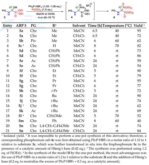 In conclusion, we developed a simple and efficient methodology for the preparation of N-protected bisphosphonic analogs of protein and non-protein α-amino acids. The optimization of our procedure, consisting of the reaction of 1-(N-acylamino)-1-ethoxyphosphonates 3 with triphenylphosphonium tetrafluoroborate and triethyl phosphite, highlights the one-pot synthesis conducted in mild conditions. In most cases, there is no need to use any catalyst as it is autocatalytic in nature. Relatively easy access to the starting α-ethoxyphosphonates 3, obtained from ethyl N-acylimidates 2, simple work-up of the reaction mixture and good to excellent yields of the target products 5 are additional advantages of the proposed protocol. The methodology provided constitutes a convenient approach for the synthesis of structurally diverse N-protected 1-aminobisphosphonate derivatives 5 and can be considered a new universal strategy for the construction of bisphosphorus organic compounds containing the P-C(N)-P skeleton.