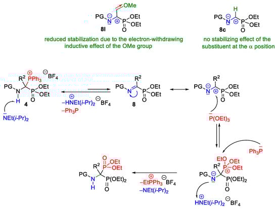 The functional role of Hünig’s base as a catalyst in the synthesis of a bisphosphonic serine derivative relies on assisting the generation of the corresponding N-acyliminophosphonate 8l from the resulting phosphonium salt 4l during the final Michaelis–Arbuzow-type reaction. This is the rate-determining step of the transformation. For the serine model, due to the presence of an electron-withdrawing methoxymethyl group at the α position, the stabilization of the iminophosphonate 8l is reduced (Scheme 5), so that the reaction equilibrium is strongly shifted toward the phosphonium salt 4l. Hence, the addition of Hünig’s base is necessary to allow the Michaelis–Arbuzov-type reaction to be performed, as it is shown in the postulated mechanism for this transformation (Scheme 5).
