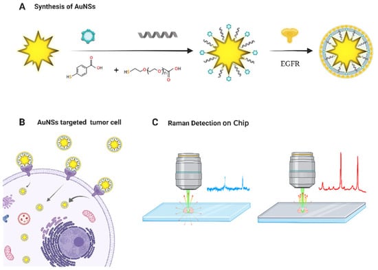 The complex mechanisms of tumor cell invasion and growth require a special tumor microenvironment to meet specific growth needs, including the pH and calcium concentration; in addition, tumor cells have a strong migration capability [25,26]. Traditional surgery, radiotherapy, and chemotherapy cannot overcome the migration of tumors, especially the small number of cells flowing into the blood or other tissues [27,28]. Therefore, tracking tumor cell movement based on the target and location and obtaining stable and sensitive Raman detection signals simultaneously remains one of the main challenges in the application of functional Au nanomaterials in clinical tumor-targeted diagnosis. To address this problem of signal sensitivity, we developed a detection method that can realize specific localization, tracking, and a high-intensity SERS signal, which was applied to the diagnosis of tumor cells in vitro [21]. First, a functionalized Au nanomaterial was prepared. Surface-modified Au nanoparticles were combined with the EGFR of tumor cells to enable targeted localization [20,29,30]. The signal from the coupling of antigen and antibody was detected using surface-enhanced Raman technology, obtaining high sensitivity and high-intensity SERS signals of the functionally modified AuNSs. In addition, a new detection chip was prepared for the collection of Raman detection signals. This chip can physically enhance the Raman signal of functionalized nanoparticles, with a signal intensity that is 40 times higher than that of quartz glass. This method combines physical enhancement and SERS enhancement technology to achieve a dual-enhancement effect to enable the detection of tumor cells with high sensitivity and stability. This highly stable and sensitive functional material has potential clinical value for the diagnosis of tumor cells (Figure 1.).