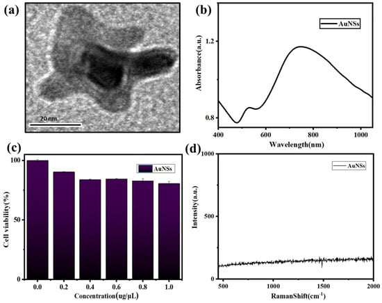 The size and appearance of the AuNSs were relatively uniform; the morphology of AuNSs was pentagonal, further optimizing can obtain a more uniform morphology and size, as shown in Figure 2a. Figure 2b showed that the UV characteristic absorption peaks of AuNSs appeared at approximately 530 and 780 nm. The cytotoxicity verification experiment using the mouse epithelial fibroblast cell line L929 showed that AuNSs have good biocompatibility, with a cell survival rate about 85% after incubation with 1 µg/µL AuNSs (Figure 2c). Au nanoparticles are a metal element without other atomic and molecular chemical bonds, therefore, AuNSs have no Raman signal (Figure 2d).