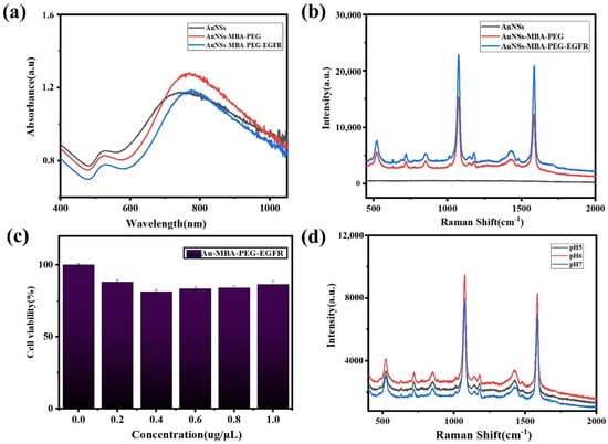 After the reaction between the AuNSs and the modified group [33], we preliminarily optimized the reaction ratio and tested the UV absorption of each step of the reaction: AuNSs, AuNSs and MBA, AuNSs, MBA, and PEG, and AuNSs, MBA, PEG, and EGFR. As shown in Figure 3a, the corresponding absorption peaks redshifted after each step of the reaction [34,35]. As shown in Figure 3b, there was no Raman peak when only AuNSs were present, whereas the AuNSs modified with MBA and PEG had strong Raman absorption characteristic peaks at 1084 and 1585 cm−1, indicating that the AuNSs modified with MBA and PEG had a strong surface-enhanced Raman effect after surface functionalization. Moreover, the signal of AuNSs modified with MBA and PEG reached a higher enhancement after EGFR modification. The functionalized AuNSs have a good biocompatibility, as shown in Figure 3c. In addition, the pH of the functionalized AuNSs was optimized, as shown in Figure 3d, and the Raman signal of the functionalized AuNSs was confirmed to be stable in an acid-base environment with a pH range of 5 to 7, and was not readily affected by the environmental pH. Therefore, this functional nanomaterial is promising for the targeted tracking and detection of tumor cells in vitro.