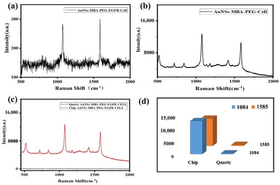 To address the problem of signal sensitivity, a coated detection chip was prepared, which exhibits strong reflection and serves as a convergence signal and secondary excitation sample for the SERS probe. The experimental results showed that the relative Raman signal value of ordinary SERS was enhanced to (3 × 102 accounts); the relative Raman signal value of Raman chip was (1.2 × 104 accounts), which is 40 times higher than that obtained on an ordinary quartz slide. This study combined physical enhancement and SERS enhancement technologies to achieve dual enhancement, enabling the detection of a highly sensitive and stable Raman signal. The targeting and specificity of functionalized AuNSs for cancer cells, referenced by the results of previous studies, provides theoretical support for this view [18,36]. If EGFR is replaced by other marker molecules, the same double enhancement effect would be achieved.