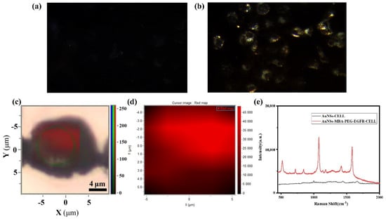 Functionally modified AuNSs and unmodified AuNSs were added to the cells and dark-field imaging was performed after incubation. As shown in Figure 5a, the cells with unmodified AuNSs showed a certain scattering signal, but they were very weak. The scattering signal intensity of the functionalized AuNSs was strong and most of the scattering signal intensity concentrated around the edge of the cell, while the scattering signal intensity in the middle of the cell is very weak and the imaging is very dark, further confirming the targeting ability of the functionalized AuNSs, as shown in Figure 5b. A Raman chip was used as the detection substrate to collect the Raman signal of a single cell and the cell was scanned by regional Raman mapping, which more intuitively showed the distribution of Raman signal in a cell, as shown in Figure 5c. The color change from black to red corresponds to the change in the Raman signal from weak to strong, as shown in Figure 5d. Figure 5e shows the Raman data comparison; the functionalized AuNSs were incubated with the cells, resulting in a high-intensity Raman signal, whereas there was only a weak Raman signal of the cell itself after being incubated with unmodified AuNSs, and there was no signal enhancement, obtaining high sensitivity and high-intensity SERS signals of the functionally modified AuNSs [34,36], as shown in the Figure 5e.