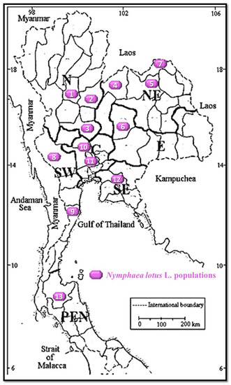 Living N. lotus plants were searched and collected from their natural habitats, covering all the floristic regions in Thailand, such as the northern (N), northeastern (NE), central (C), southeastern (SE), eastern (E), southwestern (SW), and peninsula (PEN) regions. After the literatures review and the herbarium specimen study of N. lotus, in order to obtain the fundamental information about the distribution, the targeted populations from various localities from every floristic region in Thailand were searched, so as to seek for N. lotus living specimens from the fields. The collected N. lotus samples were identified at the species level by using the taxonomic key and description in the existing Floras [1,2,3,4,5], as well as compared with the herbarium specimens kept in Forest Herbarium (BKF), Bangkok, Thailand, The Prof. Kasin Suvatabandhu Herbarium, Chulalongkorn University, (BCU). Herbarium abbreviations are used according to Thiers [36]. After that, the stamens and perianths from 13 populations of N. lotus were air-dried and then prepared following the World Health Organization recommendations [37].