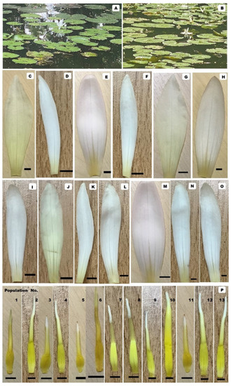N. lotus: (A,B) natural habitats; (C–O) perianths of Population No. 1–13, respectively; (P) stamens of Population No. 1–13, respectively; bar scale = 0.5 cm. Photos were taken in Thailand by Duangjai Tungmunnithum.