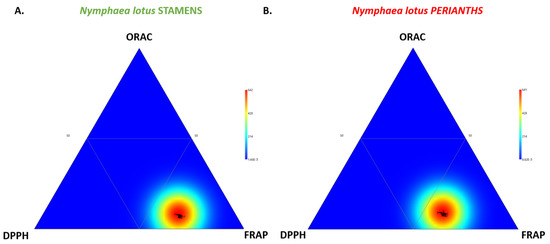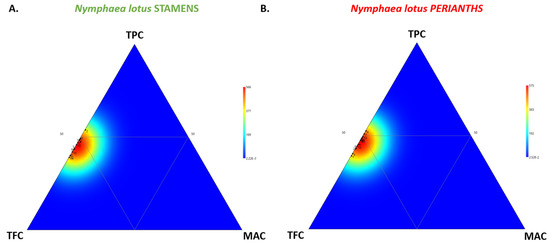The results from the ternary plot displaying the visualization of the relative proportion of TPC, TFC, and MAC within the stamen and perianth extracts (Figure 3) indicated the significance of TFC as a key factor for phytochemical variation. The heatmap distribution illustrates the marked shift of the first bottom triangle (high TFC) for each floral part, such as the stamen and perianth of N. lotus.