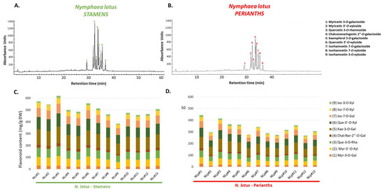According to these results, it is clearly identified that flavonoids are the major phytochemical class of N. lotus stamen and perianth extracts and play the key role in contributing to the obtained variations. Additionally, high-performance liquid chromatography (HPLC) analyses were performed to provide a more comprehensive understanding in terms of qualitative and quantitative changes in both floral parts (stamen and perianth extracts) (Figure 4, Table S1).