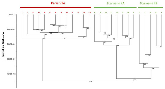 The results from the HCA analysis showed that the clustering occurred primarily at the floral-parts level based on their phytochemical profiles. On the one hand, the N. lotus perianth extracts were clustered together in the same group (Figure 5, Perianths). On the other hand, the N. lotus stamen extracts were clustered into two subgroups (Figure 5, Stamens#A and Stamens#B) based on their different flavonoid concentrations, the first subgroups (Figure 5, Stamens#B), comprising of populations #1–5, having richer flavonoids compared with the second subgroups (Figure 5, Stamens#A), consisting of populations #6–13. Nevertheless, no discernable pattern exists to demonstrate the significant genetic background factors. In view of the wide geographic distribution of N. lotus populations across the different floristic areas of the country, environmental factors may possibly be the explanation for at least some parts of the heterogeneity in the phytochemical profiles that were observed in these studied populations.