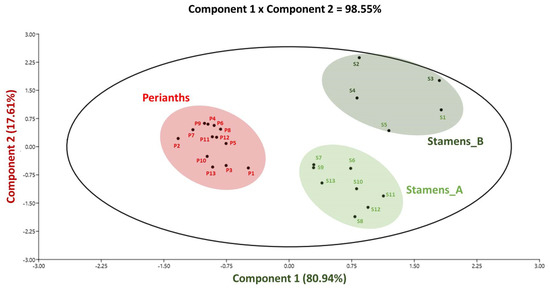 Principal component analysis (PCA) linking the phytochemical profile and antioxidant capacity of the stamen and perianth extracts of 13 N. lotus populations originating from various floristic regions in Thailand. Variance of component 1 = 80.94%, and component = 17.61%. S: stamen extract; P: perianth extract; each number in blue represents the different populations. The corresponding loading score plots for components 1 and 2 are presented in Figure S1.