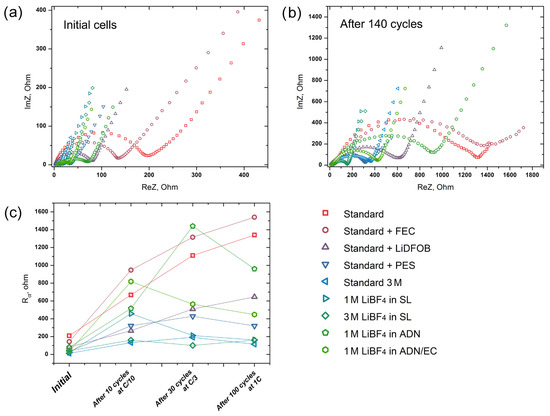 EIS spectra were collected at four different stages of the cell cycling: as-assembled, after 10 cycles at C/10 rate, after 30 cycles at C/3 rate and after 100 cycles at 1C rate. All experiments were performed at 100% depth-of-discharge (E = 2.8 V vs. Li/Li+). The Nyquist plots for the first and the last stages are presented at Figure 4a,b. We focused on the analysis of the charge transfer resistance, which is expressed in Nyquist plots as a characteristic semicircle, having an equivalent in the form of a parallel resistance and capacitance (or “constant phase element”, CPE) and being previously described and widely used for the characterization of the electrode–electrolyte interface [45]. EIS experiments divided the studied electrolytes into two groups. The first group includes solutions that are characterized by an increase in charge transfer resistance (Rct) throughout the cycling: Standard, Standard + FEC, Standard + LiDFOB. In these cases, the resistance increased by 5–7 times, from 100–200 Ohms to 700–1400 Ohms, with the largest increase occurring in the first ten charge–discharge cycles. Obviously, an increase in the resistance is associated with a steady increase in the amount of electrolyte oxidation products on the cathode surface during cycling. Other electrolytes demonstrate an interesting feature of decreasing Rct values after cycling at elevated C-rates (C/3 or 1C). For example, the cell with 1 M LiBF4 in SL demonstrated growth in the resistance from 20 to 450 Ohms during the first ten cycles, but after 30 cycles at C/3 rate and 100 cycles at 1C rate, this value decreased to 210 and 160 Ohms, correspondingly. This could be a consequence of the slightly different mechanism of SEI formation at different current densities due to the occurrence of competing processes with distinct rate constants. A large number of different species were found on the cathode surface in previous studies, including lithium carbonate, semicarbonates, fluoride, organophosphates and polymers [46]. The ratio between these components determines the electrochemical properties and the stability of the cathodic SEI. It is obvious that the variation in the cycling conditions of the cathode material can change the amount of one or another component in the SEI, since the mechanisms and rates of their formation differ for each type of reaction products. Moreover, as shown earlier, in contrast to the SEI on the anode, the cathode interface is not so stable and tends to dissolution/formation on each charge–discharge cycle, at least at moderate oxidative potentials [46].