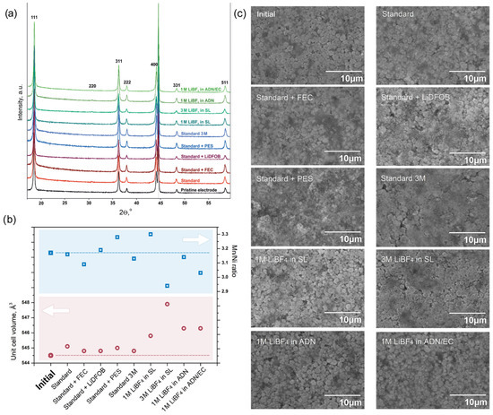 The examination of the electrodes’ surface after cycling with SEM (Figure 5c) also revealed no visible signs of degradation. We can only note a more noticeable contribution of surface films in the case of concentrated electrolytes and a partial pulverization of surface particles in the PES-containing electrolyte. However, it cannot be ruled out that the electrolyte decomposition products were dissolved during the washing of the electrodes after their removal from the cells.