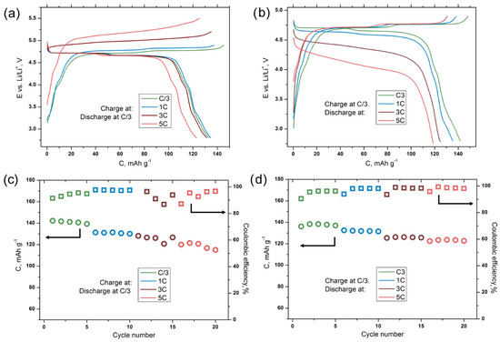 Results of the C-rate retention tests for the LiNi0.5Mn1.5O4 cathode in half-cells with 3 M LiPF6 in EC:DEC:DMC = 1:1:1 (Standard 3 M) electrolyte. (a,c) “Fast charge–slow discharge” regime; (b,d) “slow charge–fast discharge” regime.
