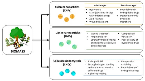 Lignocellulosic biomass is an earth-abundant resource (about 200 billion tons/year) that has much higher potential than is currently being exploited [1,2]. While it can be obtained from a variety of resources, it is essential to underline that biomass is a common industrial residue from food processing that has been exploited as a low-cost carbon source for the biorefinery. Moreover, the use of these residues as a feedstock does not compete with human food, making them an attractive alternative, considering current population growth [3]. However, in the last few years, there has been a change in the trend of lignocellulosic-biomass exploitation; from being a fuel source to other powerful applications, such as in advanced material synthesis, for the production of platform chemicals and even in some biomedical applications [4,5,6,7]. Nanoparticle-supported drug-delivery systems utilize several types of nanoparticles, both synthetic and bio-based, to store and deliver several drugs (Figure 1). Excellent results have been documented in the literature when using nanoparticle-supported delivery systems [8], as this approach provides better control of drug release and, consequently, of the side effects [9]. However, the toxicity and deformation of nanoparticles in the human body must be carefully considered. To date, many synthetic nanoparticles, such as silica nanoparticles [10], and metal oxides [11], have been successfully used as drug carriers, while those derived from natural sources have received less attention, although lignocellulosic-derived nanoparticles have recently gained increasing interest from the scientific community as drug-delivery systems, due to their biocompatibility, biodegradability and non-toxicity [12]. There are several kinds of lignocellulosic-derived nanoparticles that have been widely explored for drug-delivery systems, i.e., lignin nanoparticles (LNPs) [13,14], xylan nanoparticles (XNPs) [15], and cellulose nanocrystals (CNCs) (Figure 2) [16,17].