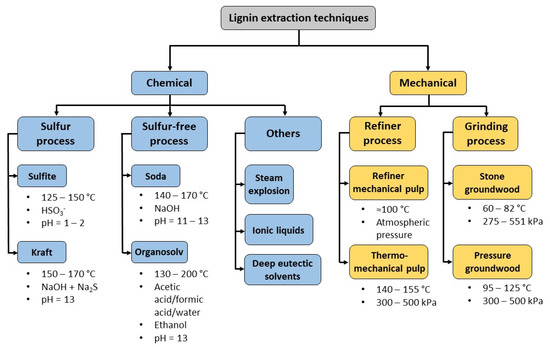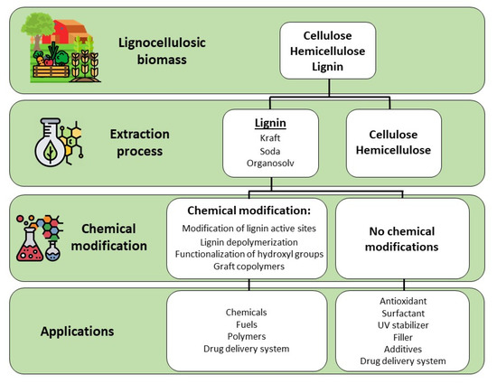 Schematic overview of lignin recovery, extraction, modification and applications.