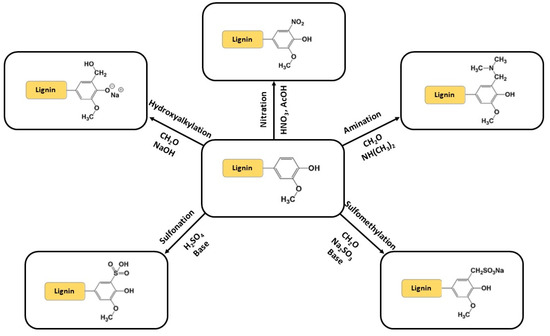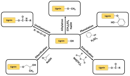After the extraction procedures, lignin can be modified via several different chemical reactions. Four different approaches can be used to chemically modify lignin: (1) synthesis of new chemically active sites; (2) lignin depolymerization or fragmentation; (3) production of graft copolymers; and (4) chemical modification of the hydroxyl groups present in the lignin structure [23,33,34].