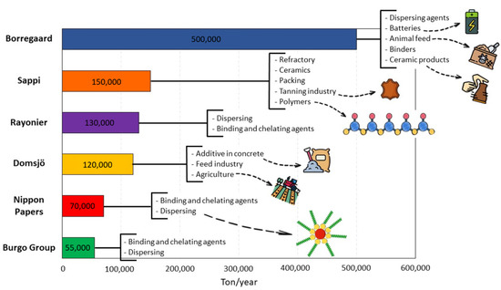 The valorization of lignocellulosic biomass currently almost exclusively focuses on the production of pulp, paper and bioethanol from its holocellulose constituent, while the remaining lignin part, which possesses the highest carbon content, is burned and treated as waste. Although no market for profitable businesses using technical lignin yet exists, the future perspectives are outstanding in the short term. Pulping companies (such as LignoBoost® and LignoForceTM) produce around 100 million metric tons of Kraft and other technical lignins per year worldwide. However, less than 2% of these lignins are commercialized, mainly as adhesives, surfactants and dispersant formulations [89] (Figure 10). Lignosulfonates are by far the most important lignin derivative, with a production of 1.3 million metric tons per year, whereas just 265,000 metric tons of Kraft lignin are isolated and used for biorefining applications today. Moreover, soda lignin and hydrolysis lignin from cellulosic ethanol production are increasing in their importance and market share, with 75,000 metric tons being produced per year [90]. Moreover, thanks to huge investments (by Stora Enso, the largest producer of LineoTM), Kraft lignin is currently the most important one, with an impact on some emergent economies and even in developed countries [91]. Hence, these lignin sources must be studied in detail in order to provide options for the development of new profitable businesses (Figure 11).