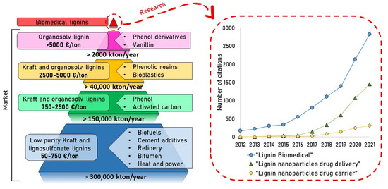 Nevertheless, the degradability of lignin in the human body is still unclear and future studies exploring this area are also necessary [73]. Furthermore, more studies are required to obtain fundamental knowledge of lignin’s impact on cells, proteins and genes before its widespread application in human health.