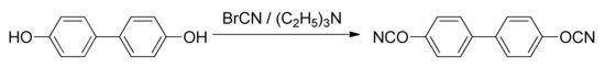 Synthesis of target cyanate ester. A mixture of cyanogen bromide (12.51 g, 0.118 mol) and 4,4′-dihydroxybiphenyl (10 g, 0.054 mol) in anhydrous acetone was stirred at −30 °C; a solution of triethylamine (16.42 mL, 0.118 mol) in acetone was added dropwise to the aforementioned cooled mixture (Figure 1). Resulting mixture was stirred for 20 min, then precipitated salt of triethylammonium bromide was filtered off and acetone was evaporated. Dichloromethane was added to a reaction mixture, followed by washing with deionized water and drying over anhydrous sodium sulfate. The crude product was then purified by column chromatography using dichloromethane as an eluent and subsequently recrystallized from dichloromethane/hexane mixture; yield = 75%. Melting point (DSC, averaged over heating rates): 137.6 °C. IR (cm−1): 2269, 2237 (-OCN functional group). 1H NMR (CDCl3–d1) δ(ppm): 7.63–7.62 (d, ArH, 4H, J = 8.73 Hz), 7.41–7.40 (d, ArH, 4H, J = 8.73 Hz). 13C NMR (CDCl3–d1) δ(ppm): 152.80, 138.47, 129.30, 116.09, 108.67.