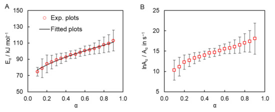 The dependence of the pre-exponential factor on conversion was estimated by substituting the values of Eα into the equation for the compensation effect: