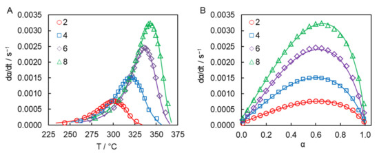 - Vyazovkin, S.; Burnham, L.; Favergeon, L.; Koga, N.; Moukhina, E.; Pérez-Maqueda, L.; Sbirrazzuoli, N. ICTAC Kinetics Committee recommendations for analysis of multi-step kinetics. Thermochim. Acta 2020, 689, 178597. [Google Scholar] [CrossRef]