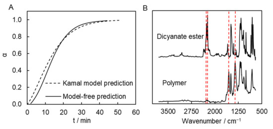 Predicted conversion-time curves for polymerization at 300 °C (A) and FTIR spectra of dicyanate ester and its polymerization product (B). Dashed lines represent absorption peaks at 2269, 2237, 1550, and 1350 cm−1.