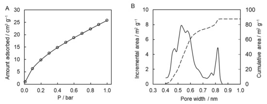 Adsorption measurement. Carbon dioxide adsorption measurement was performed with ASAP 2020 MP instrument (Micromeritics) at 0 °C. Before measurement, sample was degassed by heating at 150 °C under vacuum (8 µmHg) for 5 h. Adsorption isotherm contained about 300 points. Pore-size distribution was calculated with slit-pore geometry model by means of non-local density functional theory based software (ASAP 2020 V 4.04).