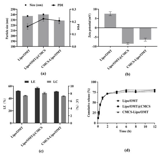 Upon OMT encapsulation and CMCS modification, the particle size, PDI and zeta potential of the OMT liposomal preparations were evaluated (Figure 1a,b). The particle size of Lipo/OMT and Lipo/OMT@CMCS are 237.34 ± 1.46 nm and 240.31 ± 1.71 nm, respectively. While a slightly reduced particle size of 228.82 ± 4.53 nm was detected for CMCS-Lipo/OMT. The PDI values of all the OMT liposomal preparations are less than 0.3, indicating uniformity of liposomes. The zeta potential of Lipo/OMT was 7.65 ± 1.09 mV. Owing to the negative charge of CMCS, the zeta potential of the CMCS-modified liposomes shifted to a negative charge. The LE and LC of the OMT liposomal preparations were approximately 53% and 8%, respectively (Figure 1c). The morphology of the OMT liposomal preparations was observed by TEM images (Figure S2).