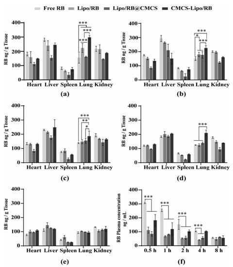 Biodistribution of RB in mice at (a) 0.5 h, (b) 1 h, (c) 2 h, (d) 4 h and (e) 8 h after quantitative pulmonary administration of RB preparations and (f) the plasma concentration of RB. All the data were expressed as mean ± SD (n = 6). * p < 0.05, ** p < 0.01, *** p < 0.001.