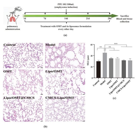 We performed a mice model of emphysema induced by PPE, as previously described [34]. Mice received PPE (10 U in 100 μL saline) by intratracheal spraying once weekly for 4 weeks to establish an emphysema model. The intratracheal spraying was conducted with MicroSprayer® Aerosolizers, as mentioned above. Mice were randomly assigned to six groups: the control group, challenged with 100 μL of saline solution by intratracheal spraying once weekly for 4 weeks; the model group, which received PPE by the same route, in the corresponding times and volume. For the intervention with medication during this period: the OMT group received 12.5 mg/kg OMT by intratracheal spraying every other day; the Lipo/OMT group received a corresponding dose of Lipo/OMT by the same route and time; the Lipo/OMT@CMCS group received a corresponding dose of Lipo/OMT@CMCS by the same route and time; the CMCS-Lipo/OMT group received a corresponding dose of CMCS-Lipo/OMT by the same route and time. After treatment, the mice were euthanized under deep anesthesia and the blood samples were collected through the abdominal aorta. Subsequently, the left main bronchus of mice was ligated, and then the trachea was incised and inserted into a cannula; bronchoalveolar lavage fluid (BALF) was collected on the right lung of mice in each group by washing three times with 0.8 mL of ice-cold PBS. Then, the right lung was carefully excised and stored at −20 °C for biochemical analyses and Western blotting. The left lung was removed and inflated in 4% paraformaldehyde (Biosharp, Beijing Labgic Technology Co., Ltd., Beijing, China) for histological analysis.