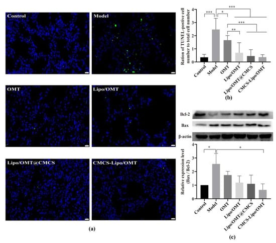 Apoptosis is a key process associated with the development of emphysema [41]. We examined whether apoptosis was increased in PPE-induced emphysema and the protective effect of OMT preparations by performing TUNEL staining of lungs. TUNEL-positive cells increased in the lungs of model mice compared with the control group, and the alveolar septal cell occupied the predominant cell type. Treatment with OMT preparations significantly prevented the increases of TUNEL-positive cells in the lung of PPE-treated mice. OMT liposomal preparations could further reduce the proportion of TUNEL-positive cells compared with OMT, especially in the Lipo/OMT@CMCS and CMCS-Lipo/OMT groups (Figure 4a,b). To investigate the molecular basis of reducing cell apoptosis in the lungs of emphysema mice by OMT preparations, the expression of Bcl-2 and Bax was detected (Figure 4c). Consistent with the results of apoptosis, the ratio of Bax to Bcl-2 was remarkably elevated in the emphysema model group compared with the control group and it was reduced by the OMT preparations. Intriguingly, a significant difference was only detected between CMCS-Lipo/OMT and the model group. It is indicated that OMT preparations exert an anti-apoptosis activity by regulating the expression level of the Bax and Bcl-2, which might prevent the destruction of pulmonary parenchymal.