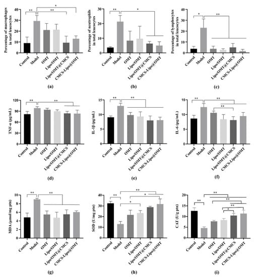 Effect of OMT and its liposomal preparations on the inflammation and oxidation stress in PPE-induced emphysema mice. The percentage of (a) macrophages, (b) neutrophils and (c) lymphocytes in total leucocytes of BALF. The level of (d) TNF-α, (e) IL-1β and (f) IL-6. The levels of (g) MDA, (h) SOD and (i) CAT. (a–c) Data represent the means ± SD (n = 3). (d–i) Data are expressed as mean ± SD (n = 5). * p < 0.05, ** p < 0.01.
