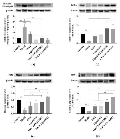 To further investigate the protective mechanisms of OMT and its liposomal preparations on PPE-induced emphysema, the expression of NF-κB and Nrf2 was detected. Researchers found that the expression of NF-κB p65 is significantly increased in emphysema patients and animal models [47,48]. As an important transcription factor that is closely related to inflammation, NF-κB plays a key role in regulating the immune response and cytokine activity [49]. The activation of NF-κB p65 is restricted by the interactions with IκBα. In response to external stimuli, IκBα is ubiquitinated and degraded by proteasomes, leading to the phosphorylation of NF-κB and translocation to the nucleus, which results in inflammatory responses [50]. In terms of oxidative stress, Nrf2, as a nuclear transcription activator, regulated the induction of defensive genes encoding the detoxifying enzymes and antioxidant proteins [51]. HO-1 is a downstream protein of Nrf2, which showed protective effects against oxidative stress [52]. According to the previous reports, decreased expression of Nrf2 was observed in the lung of emphysema patients, while the therapeutic regimens that maintained or promoted the level of Nrf2 was potential therapy for emphysema [53].