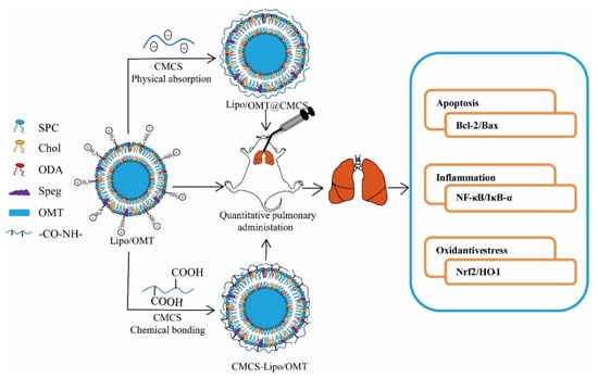 For the treatment of respiratory diseases, pulmonary administration is preferred due to its advantages in escaping from first-pass metabolism and directly targeting delivery to lung tissue, leading to high bioavailability, rapid absorption, and fewer adverse effects [17,18]. Nevertheless, pulmonary administrated medicines have to overcome various physiologic barriers, including pulmonary clearance, enzymatic degradation, and a short half-life [19]. Nano-sized drug delivery systems have been employed to address these challenges in pulmonary administration [20]. Liposome, with great biocompatibility and safety, has been widely used in the pulmonary delivery of both hydrophilic and hydrophobic drugs, which could protect the drug from enzymatic degradation and prolong pulmonary retention [21]. The OMT-encapsulated liposome was first reported in the treatment of hepatitis [22]. It was verified with improved in vivo stability, prolonged circulation, and accumulation of OMT at the targeted organs [23,24,25], which is a promising nanoformulation of OMT for pulmonary administration.