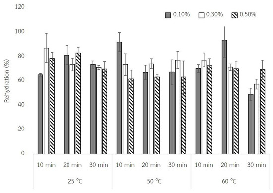 The physical properties and also microstructure of cooked rice has been improved by using baking powder [3] and also by adjusting the soaking temperature and soaking time [5]. The Quick Black Jasmine Rice were differently pretreated with baking powder solutions of 0.1, 0.3, or 0.5% at room temperature, 50, and 60 °C for 10, 20, and 30 min. The physical properties of the samples including the rehydration capacity, morphology, and texture of the samples were observed. The rehydration capacity of QBJR samples with reference to the amount of absorption water are shown in Figure 1.