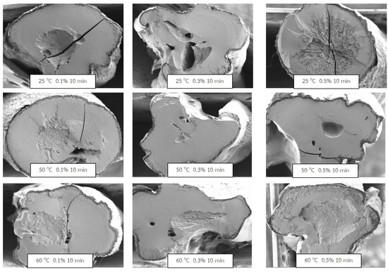 Figure 2 shows that the higher soaking temperature resulted in a higher small pore, while at high baking powder concentrations, a hollow channel could be found. However, the lower soaking temperature caused a bigger hollow channel in the center of the grain. This appearance was related to the higher rehydration capacity of the samples with soaking at room temperature. Moreover, the soaking time did not significantly affect the morphology of the sample grains.