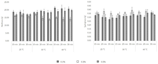 After rehydration, the texture of QBJR samples were determined and the results are shown in Figure 3. The results revealed that the hardness of the sample was interfered with by three factors of soaking processing. At higher soaking temperatures, more hardness was found in the sample. On the contrary, the springiness of the sample was affected by the concentration of baking powder. However, the baking powder concentration of 0.3% gained the highest values of hardness and springiness.