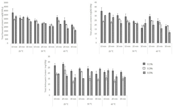 This research has studied three processing factors on the total phenolic (TPC), total flavonoid (TFC), as well as total anthocyanin (TAC) content as shown in Figure 4. The results exhibited that the higher baking powder concentration and soaking temperature for a longer time declined the bioactive compound content in QBJR. This can be explained by the pH-sensitive bioactive compound, for which the baking powder conferred a higher pH to the soaking water and resulted in the unstable phenolic, flavonoid, and anthocyanin contents in the QBJR. Moreover, these compounds are heat-sensitive and water soluble, hence the high soaking temperature and longer soaking time resulted in the destroying and leaching of all bioactive compound to the soaking water.