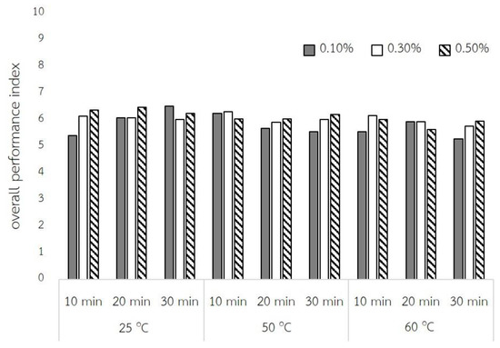 In order to evaluate the best condition for the QBJR samples with the high physical properties, a high bioactive compound content, and a high sensory score, the fuzzy assessment was performed. The nine sub-criteria and their weights were used to examine the following details. For the physical properties, the data regarding rehydration capacity, hardness, and springiness were used. Each datum of the physical properties was weighted to 15, 10, and 5% for rehydration capacity, hardness, and springiness, respectively. Moreover, the weight of the bioactive compound was 10, 10, and 20% for TPC, TFC, and TAC, respectively. In the meanwhile, the weight of each attribute of sensory score was equal to 10%. The overall performance index of 27, indicating the processing condition, is shown in Figure 6. The best condition was the soaking the BJR in 0.1% of baking powder at room temperature for 30 min with the highest overall performance index of 6.52.