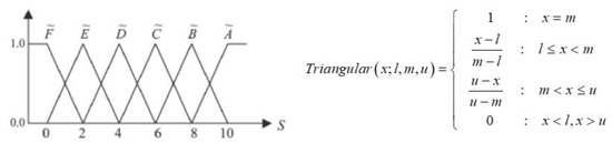 So, each data in the different boundary were transformed in the same range [0, 10], for which this range was used to define the fuzzy performance grade sets by using the triangular fuzzy numbers, as seen in Figure 7.