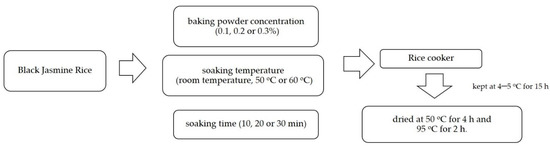 The black jasmine rice (BJR) was rinsed with water and then soaked in the different concentrations of baking powder solution (0.1, 0.3 and 0.5%) and different temperatures (room temperature, 50, and 60 °C) for 10, 20, and 30 min, and the ratio of rice to solution was 1 to 25 w/v. After that, the BJR was cooked in a rice cooker at cooking temperatures of about 100 °C. The cooked BJR was kept at 4–5 °C for 15 h and then was dried at 50 °C for 4 h and 95 °C for 2 h. The Quick Cooking Black Jasmine (QBJR) sample from each condition was kept in a plastic bag and stored at room temperature before further analysis. The schematic diagram of Quick Cooking Black Jasmine production in this work is shown in Figure 8.