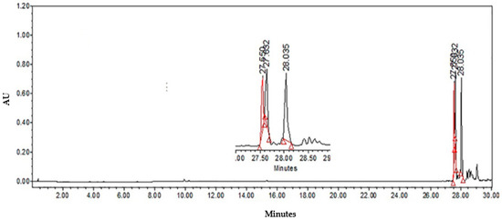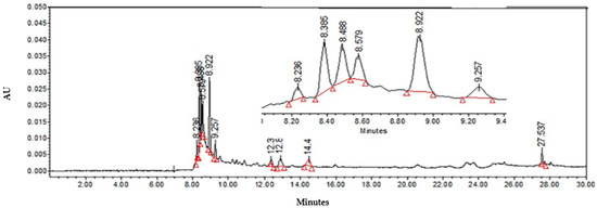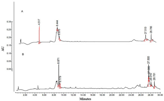 HPLC analyses were performed to determine the compounds contained in both fractions. Compared with LTHE (Figure 1), the aqueous fraction (Figure 2A) did not show peaks corresponding to flavonols and caffeic acids derivatives. Nevertheless, nor-3 demethoxyisoguaiacin (27.513 min) was observed, although in lower concentration than in the organic fraction (Figure 2B) (27.500 min), in which caffeic acid derivatives (8.871 min) and quercetin–glucoside (9.179 min) were also present.