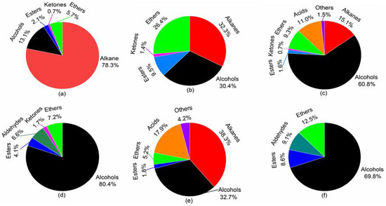 For the initial emission stage (Figure 2a), alkanes were the most abundant emission components, accounting for more than 75% of the TVVOC concentration, followed by alcohols and ethers, which constituted more than 15% of the total concentration. Esters and ketones accounted for less than 3% of the total TVVOC concentration. Alcohols, esters, and ethers were partially derived from MDF and the veneered surface, and another large part came from the solvents, cosolvents, and auxiliary additives used in the production of the water-based lacquers.