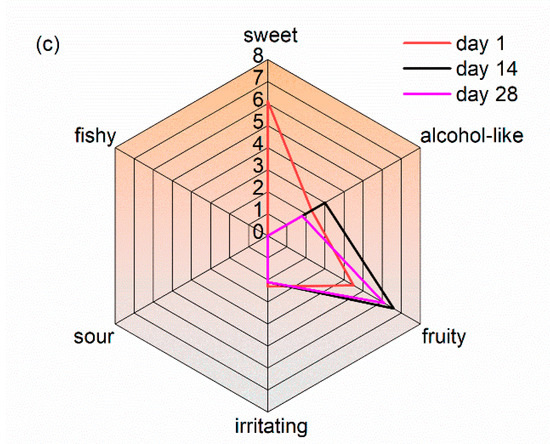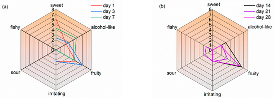 Figure 3 shows the odor radar profile of WB-MDF. As shown in Figure 3a, four odor characteristics appeared on day 1. Sweet was the dominant odor impression, with a high odor level of 6.1, followed by fruity at 4.5, and both contributed decisively and predominantly to the formation of the overall odor. Moreover, alcohol-like and irritating shared the same odor profile; both showed a fundamental complementary contribution with an odor rating of 2.3. On day 3, the major odor characteristic was altered and fruity was the major odor impression, with an odor rating of 5.9, playing a crucial contributory role to the formation of the overall odor profile. It was followed by alcohol-like (2.8). The other two odors, sweet and pungent, with an intensity of about 2, contributed a complementary modulating function. However, from day 3 to day 7, the alcohol-like odor became dominant, with a continuous decrease in intensity.