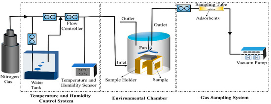 According to GB/T 29899-2013, a 15 L environmental chamber with controlled temperature and humidity conditions was used for gas sampling and proved to correlate well with a 1-m3 climate chamber [33]. This chamber, consisting mainly of glass material and silicone tubes, did not release any volatile components that could interfere with the testing. The schematic representation of a 15 L environmental chamber is shown in Figure 4. The relative humidity (RH) of the chamber air was adjusted by allowing a portion of the airflow to bubble through distilled water in a glass bottle at a controlled temperature. An automatic digital temperature and humidity sensor continuously monitored the temperature and humidity of the chamber. The temperature and humidity sensors provided a measurement accuracy and precision of 0.1 °C and 0.1%, respectively. Ultra-purity nitrogen gas (purity ≥ 99.999%), purchased from Harbin Liming Gas Company as the carrier gas, was continuously injected into the chamber for the purpose of exchange with the external environment. The measuring temperature of the sample in the chamber was determined to be 23 ± 1 °C and the relative humidity to be 50% ± 5%.