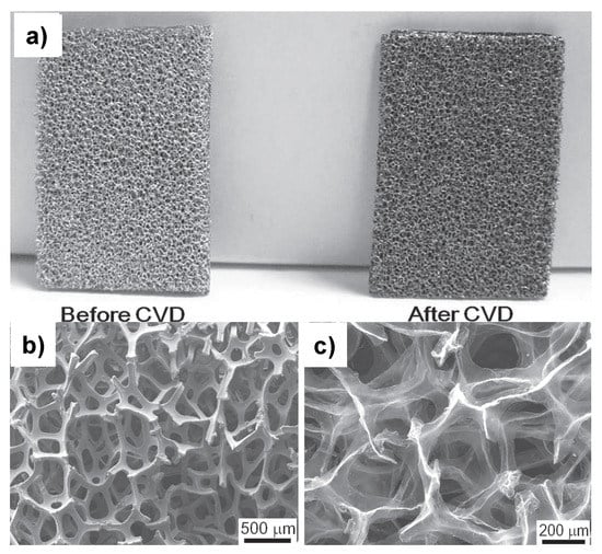 While the growing substrate is either metallic or non-metallic, the carbon sources range from gaseous (e.g., methane, ethylene, acetylene) to liquid (ethanol, benzene, styrene, petroleum asphalt) and solid (polyvinyl-alcohol, camphor) phase. The CVD method involves these carbon sources that, at temperatures of 900–1050 °C and in a controlled atmosphere of hydrogen and argon, decompose in order to deposit the graphene layers on the substrate. An example of CVD-grown graphene on both metallic and non-metallic substrates is presented in Figure 1a,b, respectively [,]. The general procedure consists of template cleaning; hydrogenation to remove the oxide layer in the case of metallic substrate, or oxidation to generate the porous structure in the case of seashell; the CVD growth process; and template etching, to release the 3D graphene foam.