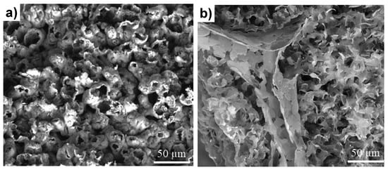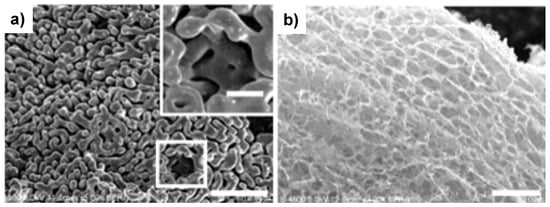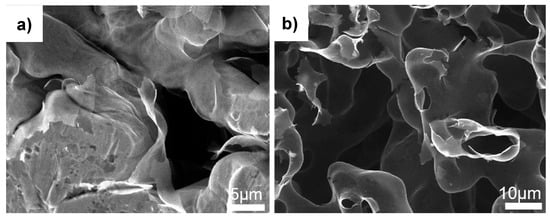 In a similar strategy, hybrid templates obtained from commercial reticulated nickel foam (400–500 µm pore size) infiltrated with nickel powder (44–88 µm and below 20 µm) were used to develop high surface area graphite foams []. The sintering temperature of the sacrificial catalytic templates was experimentally established for each type of powder, such as continuous, smooth, and interconnected networks between the nickel particles or nickel particles and nickel foam formed. As presented in Figure 3 the graphite foam replicated the structure of the metallic hybrid template. Sintering hybrid Ni foam and Ni powder reduced the pore size and increased the surface area of the graphite foam, to gravimetric and volumetric specific surface areas of 5.77 m2·g−1 and 0.52 mm2·m−3, respectively.