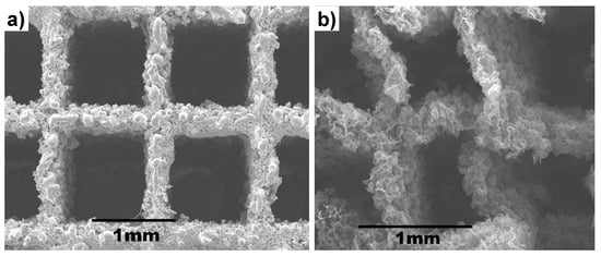 Differently from the commercial Ni foam approach, a 3D porous Ni skeleton [] was formed by reducing the NiCl2·6H2O in Ar/H2 atmosphere at 600 °C. This presents the advantage of developing macroscopic objects with relatively low porosity at atmospheric pressure, in a short time. Such 3D porous cross-linked Ni networks offer high mechanical and electrical properties, as well as low porosity.